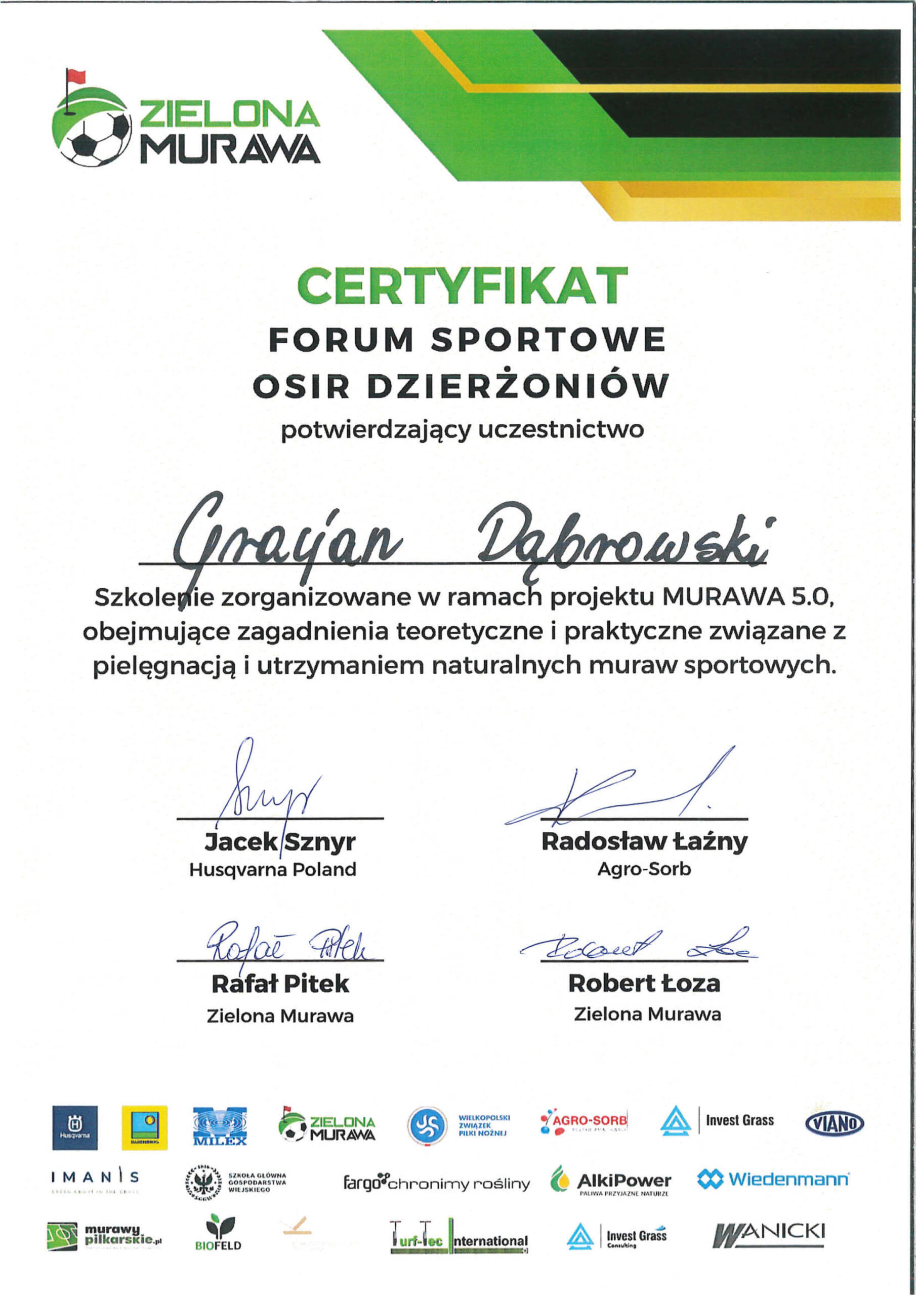 Nasze zaangażowanie w utrzymanie boisk w doskonałej kondycji zostało wielokrotnie potwierdzone przez liczne certyfikaty i wyróżnienia. Posiadamy certyfikaty od renomowanych organizacji branżowych, które potwierdzają nasze kompetencje oraz zgodność z międzynarodowymi standardami.